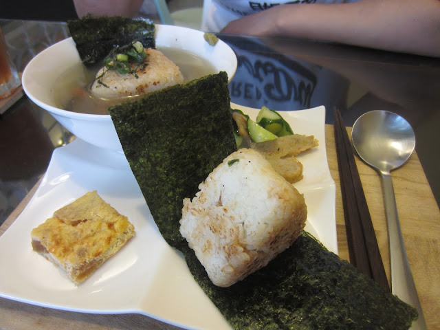 豬肉飯團來咯!One to be eaten by itself, and the other mixed with soup :)